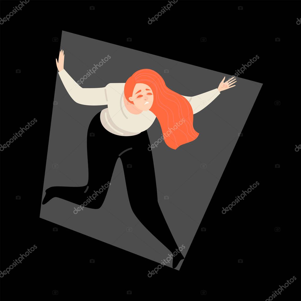 VECTOR ILLUSTRATION SMALL SPACE BOX SINGLE PERSON GIRL FEMALE YOUNG PEOPLE HEALTH DANGER ILLNESS CARTOON CHARACTER EMOTION CONCEPT WOMAN PRESSURE STRESS ROOM DISEASE INSIDE CLOSED PROBLEM DEPRESSION HORROR SCARY BEHAVIOR SAD FEAR MENTAL ANXIETY DEPRESSED SCARED FRIGHTENED AFRAID TERRIFIED PANIC PHOBIA PSYCHOLOGY DISORDER UNHAPPY ANXIOUS SUFFER CLAUSTROPHOBIA CLAUSTROPHOBIC PARANOIA CRAMPED