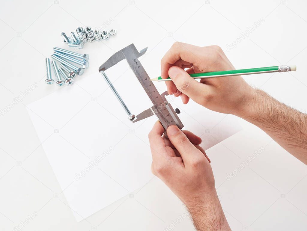 - hands with a caliper measure bolts and nuts. on white background