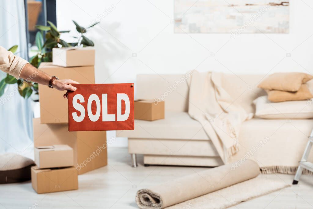 Cropped view of man holding nameplate with sold lettering near cardboard boxes in living room at background