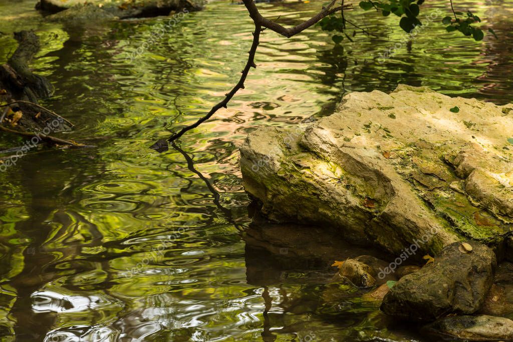 - Big stone in the creek under the green branches of a tree