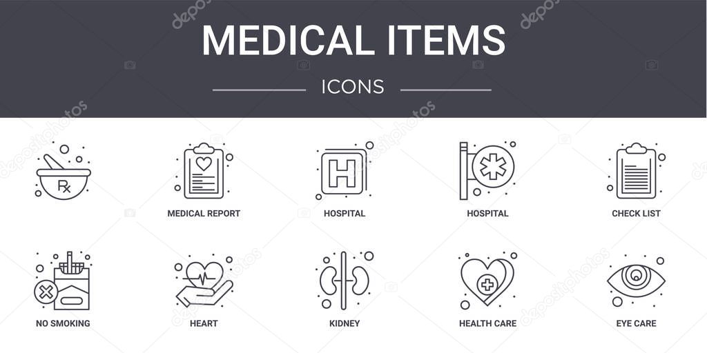 Medical items concept line icons set. contains icons usable for web, logo, ui/ux such as medical report, hospital, no smoking, kidney, health care, eye care, check list, hospital