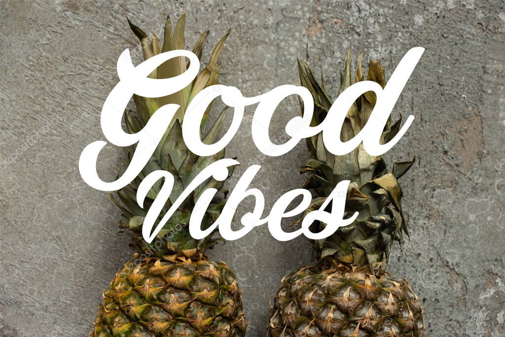 top view of ripe pineapples on grey concrete surface, good vibes illustration