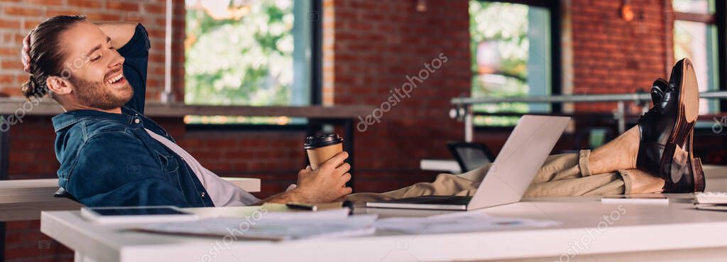 Panoramic crop of cheerful businessman holding paper cup and looking at laptop in office