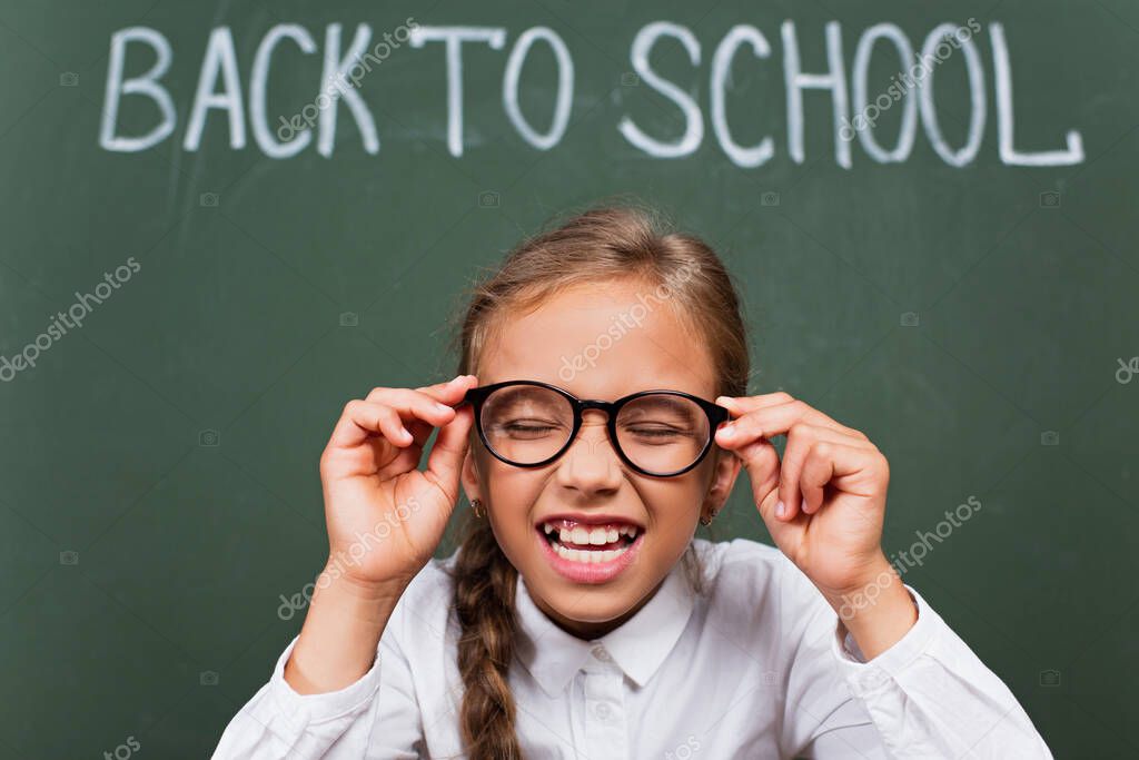 Selective focus of excited schoolgirl laughing with closed eyes and touching eyeglasses near chalkboard with back to school inscription