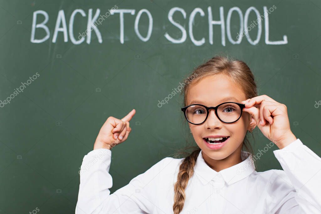 Selective focus of smiling schoolgirl touching eyeglasses and pointing with finger at chalkboard with back to school lettering