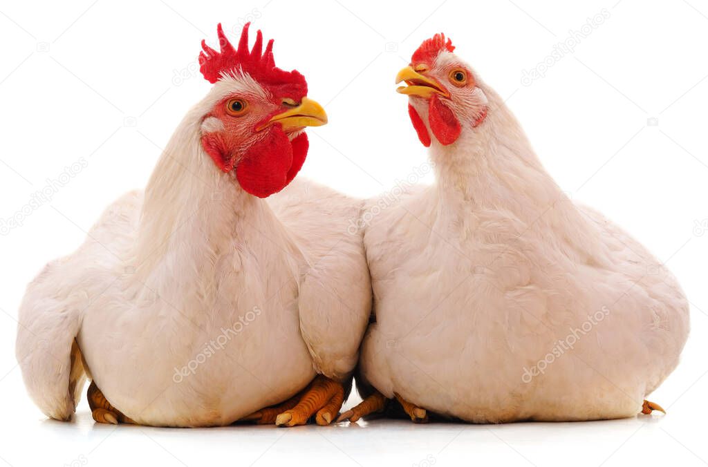 Two white chickens isolated on a white background.
