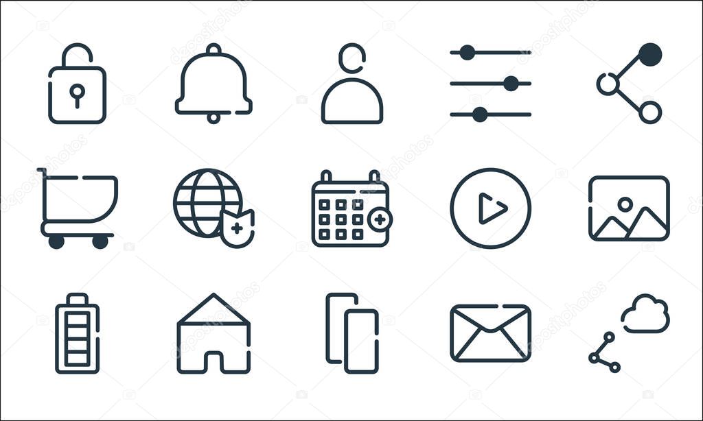 Ui master line icons. linear set. quality vector line set such as share, copy, battery, email, home, cart, play, filter, notification