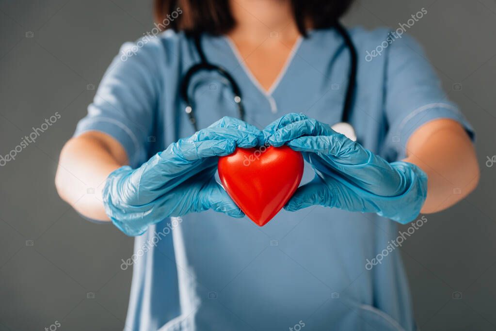 - cropped view of doctor with stereoscope in latex gloves holding red heart isolated on grey