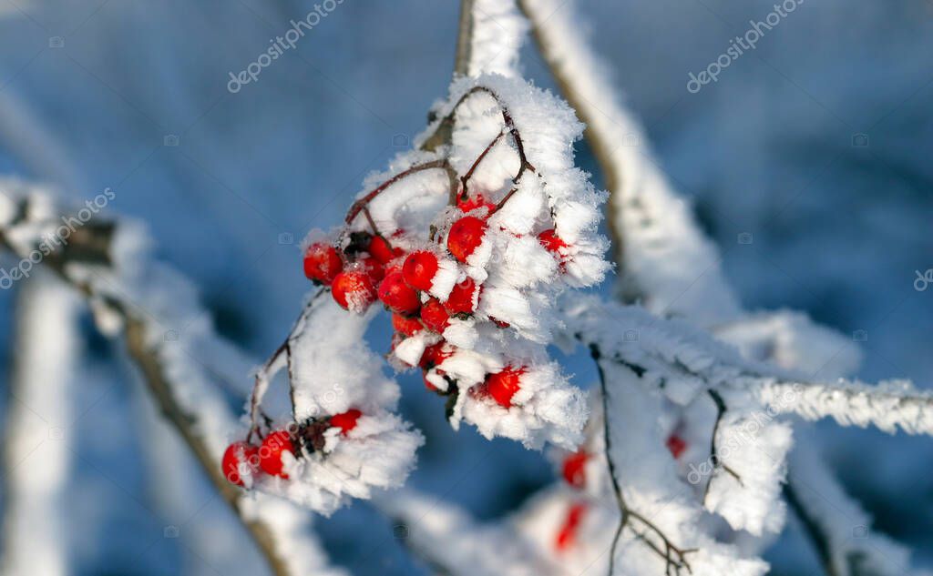 Close-up of red berries of viburnum and rowan in the winter frost frosty morning