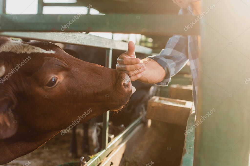 Cropped view of rancher touching nose of brown cow on dairy farm, selective focus