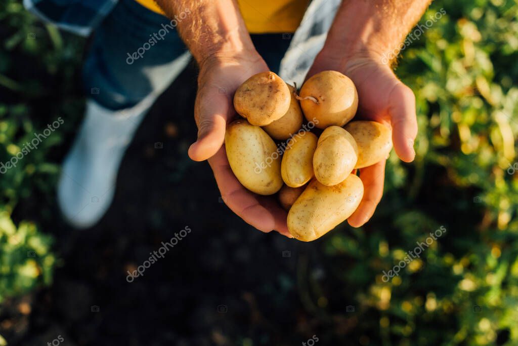 - cropped view of rancher holding fresh potatoes in cupped hands, selective focus