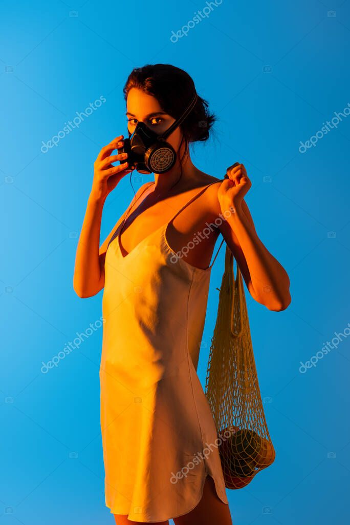 young woman touching gas mask and holding reusable string bag with fruits on blue