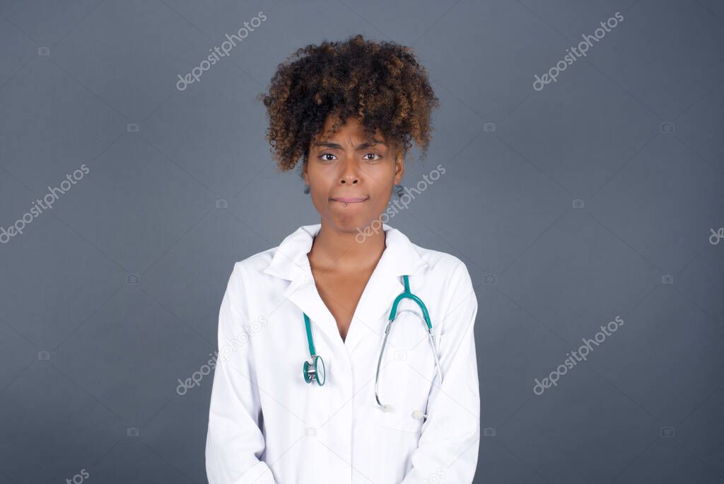 - Pensive attractive african american woman doctor in thoughts, raises eyebrows, curves lip. stands against gray wall with copy space for your text.