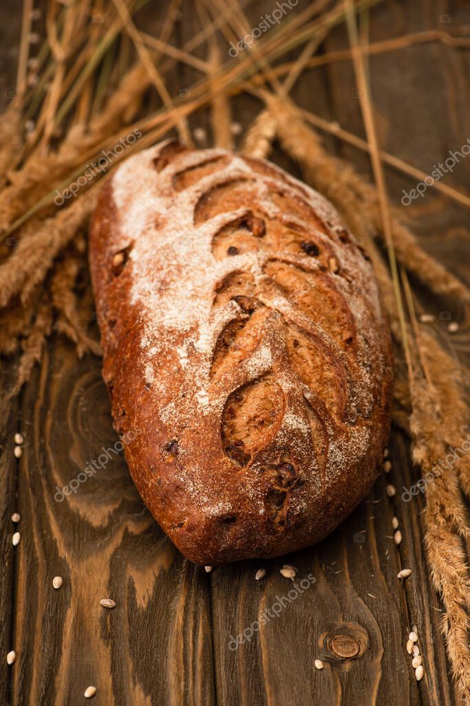 Selective focus of fresh baked bread loaf with spikelets on wooden surface
