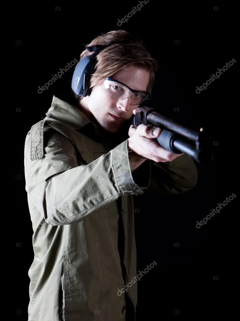Man aiming a shot gun with protective gear
