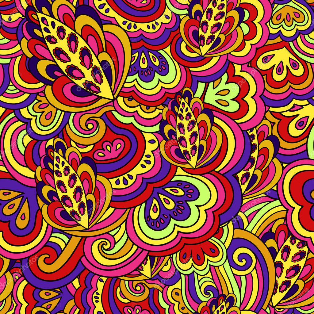 - Seamless psychedelic pattern with crazy colorful ornamental elements.
