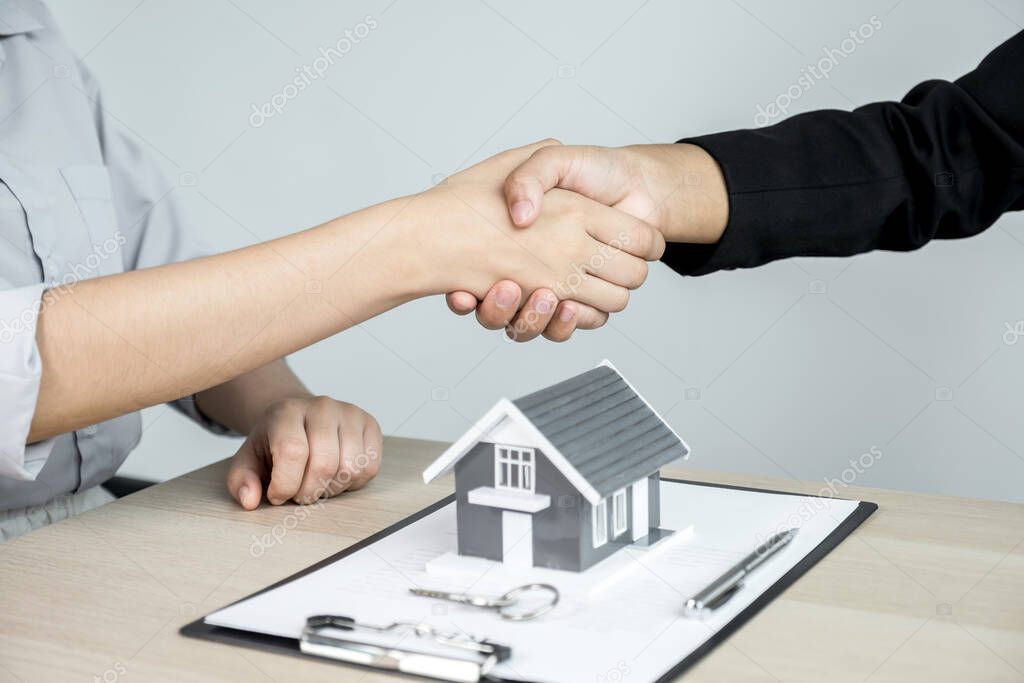 Hands shaking after Real estate agents explains a business contract, lease, purchase, mortgage, loan, or home insurance to buyer.