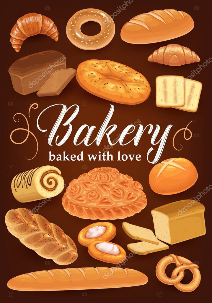 - Bakery bread, pastry cakes and desserts, croissant and baguette vector poster. Bakery shop baked food menu, sweet buns, wheat loaf and rustic bread toasts, pretzel bagel and sweet roll pie