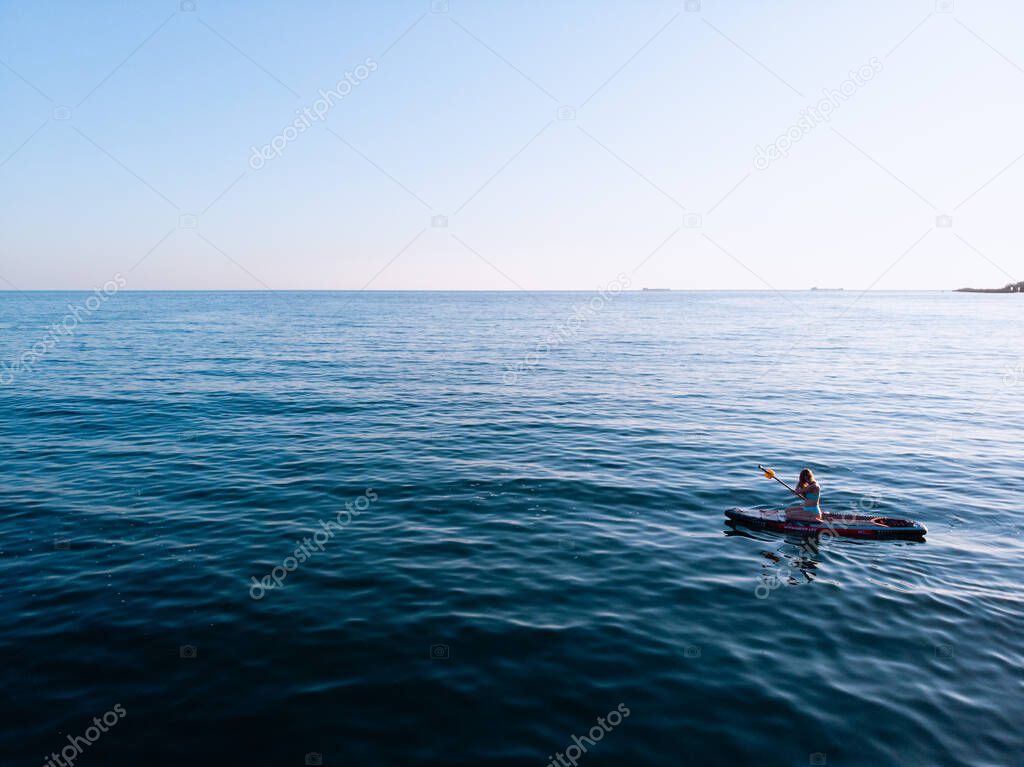 Attractive Woman on Stand Up Paddle Board, Woman paddling on sup board and enjoying turquoise transparent water. Tropical travel, wanderlust and water activity concept. Sunset and relax