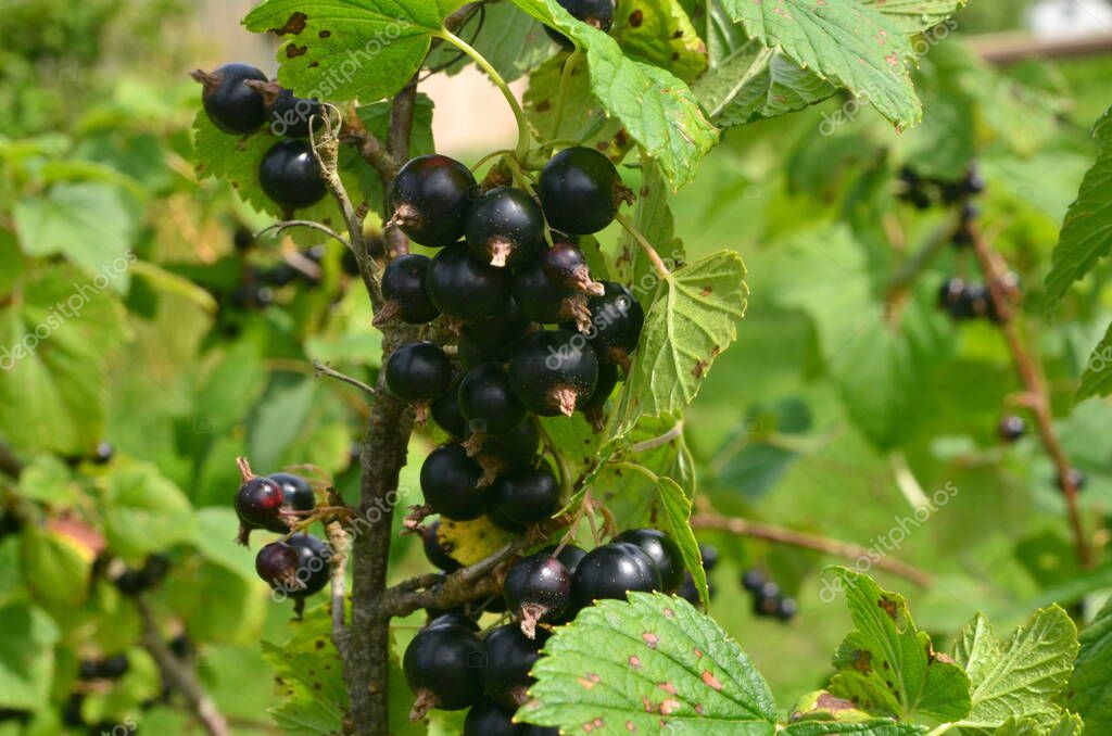- Blackcurrants on the branch in the garden, harvest of blackcurrants on the branch.Black currants on the bush branch in the garden.
