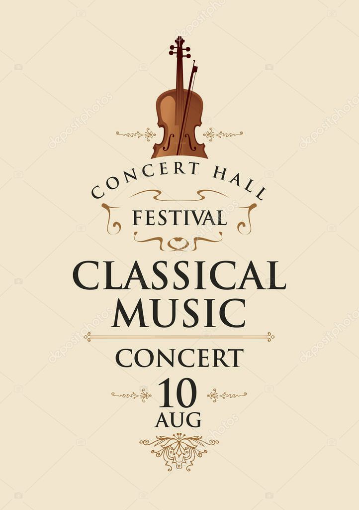 - Vector poster for a classical music concert or festival with a violin and bow in retro style on a light background