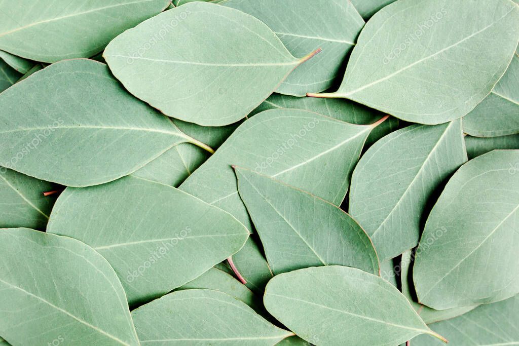 Background, Texture made of green eucalyptus leaves. Flat lay, top view