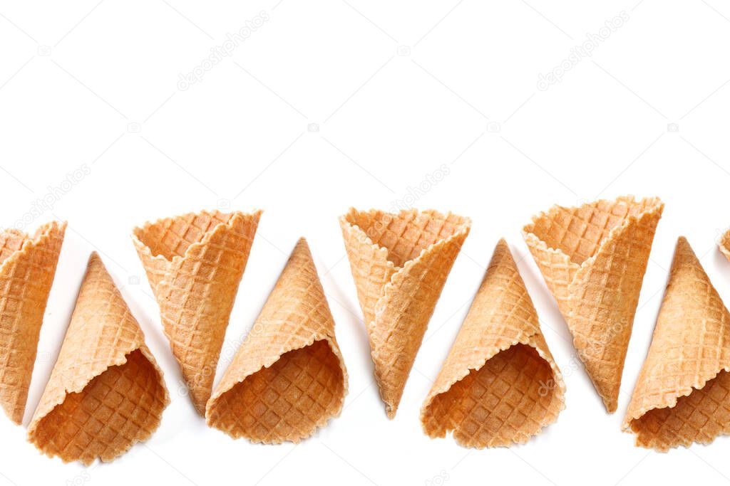 Empty wafer cone cups for ice cream isolated on white background.