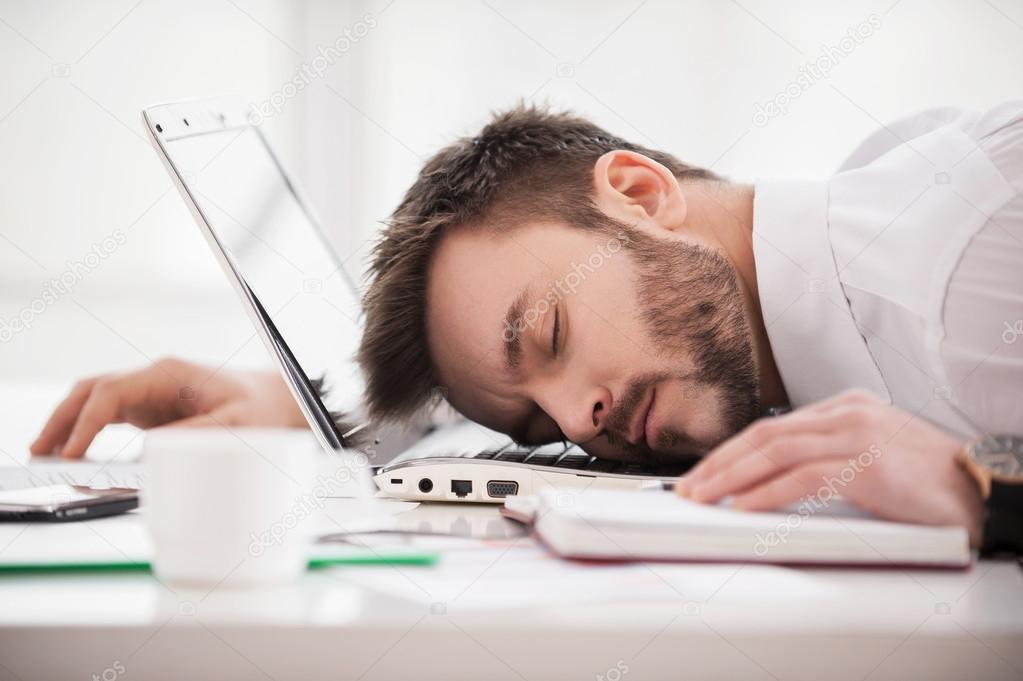 Sleeping at working place. Young man in formalwear sleeping at the working place
