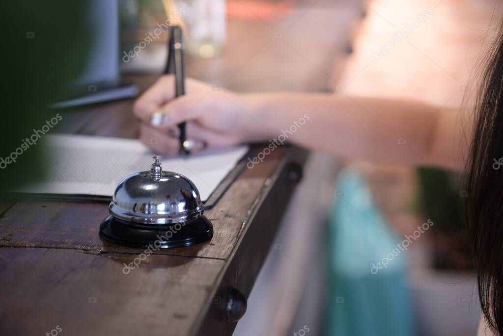 Woman guest at the reception of hotel checking in