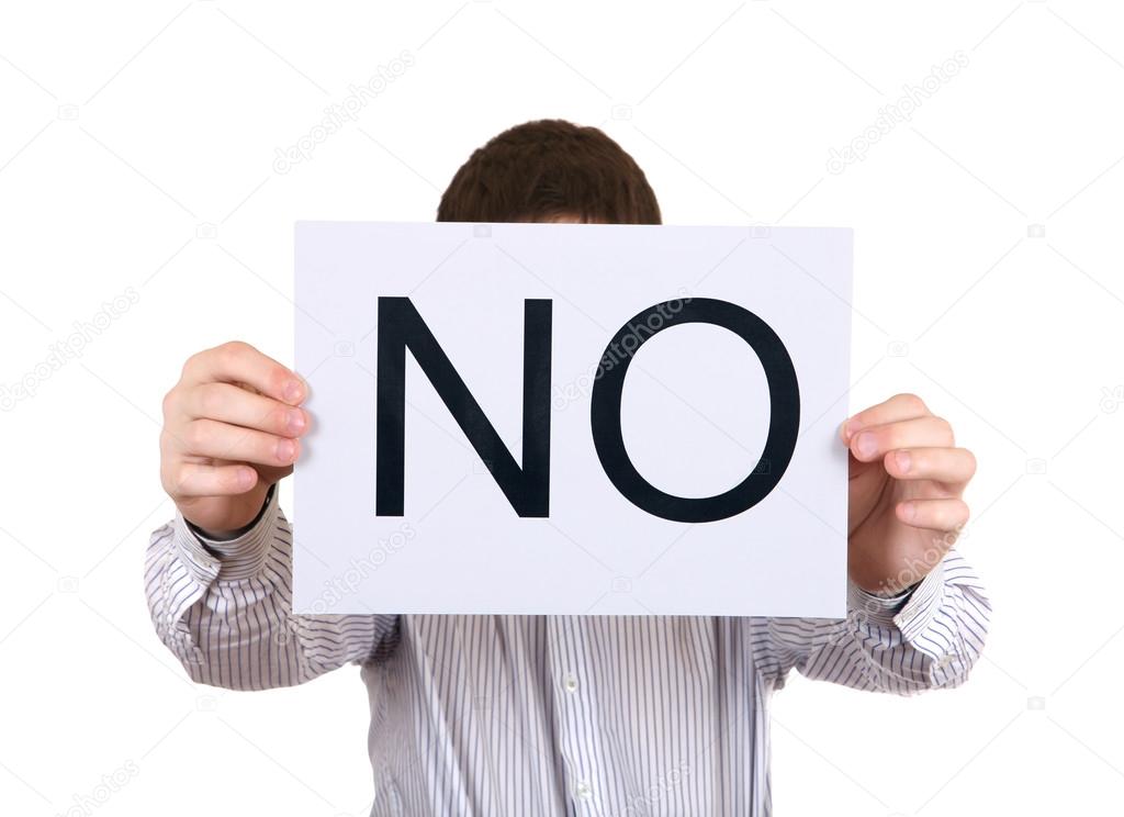 Person shows Paper with slogan NO on the White Background
