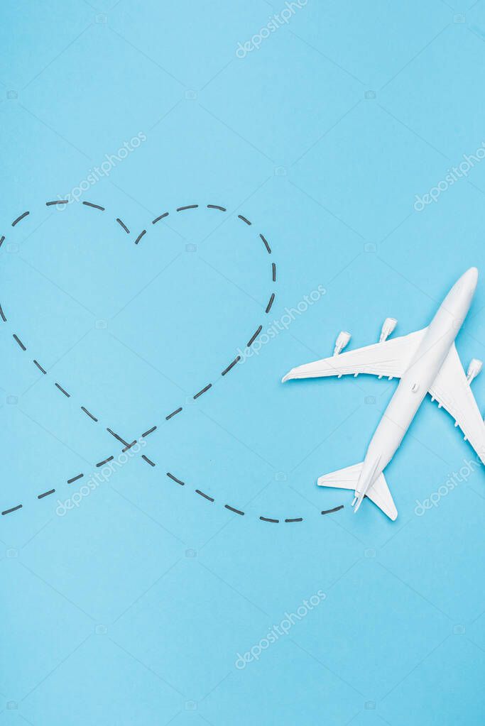 Top view of white plane model and heart on blue background
