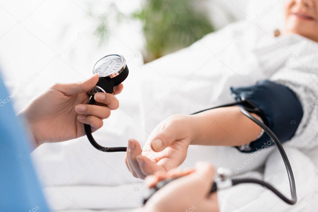 selective focus of nurse measuring blood pressure of aged woman