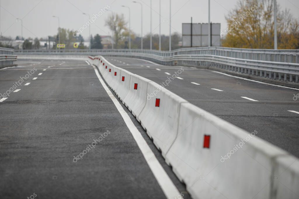 - Shallow depth of field (selective focus) image with concrete Jersey barriers (Jersey walls or Jersey bumps) on a highway.