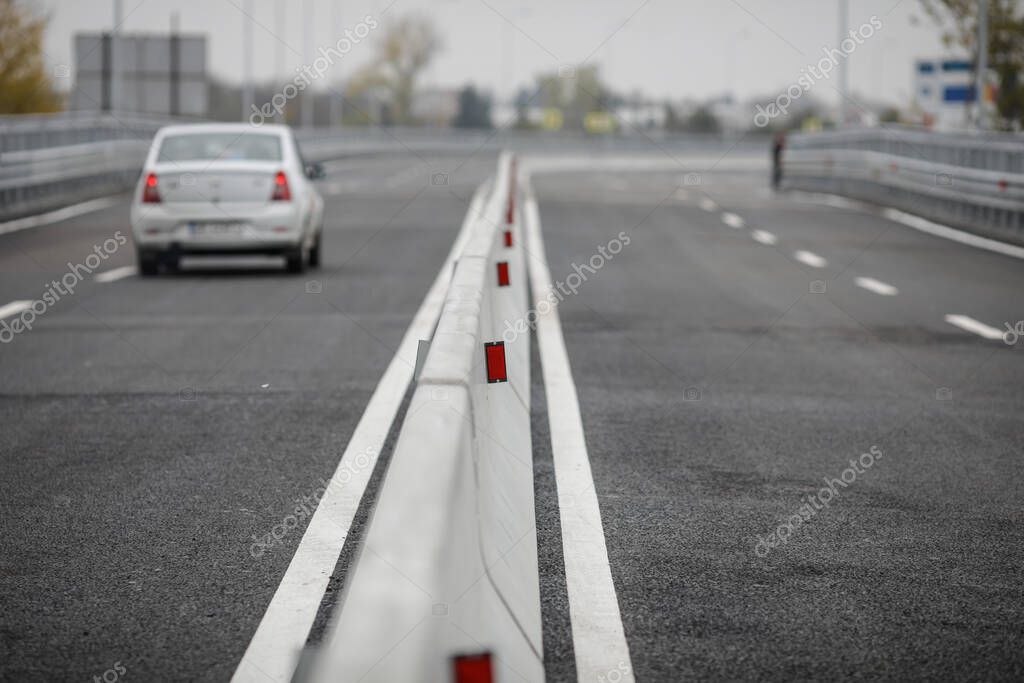 - Shallow depth of field (selective focus) image with concrete Jersey barriers (Jersey walls or Jersey bumps) on a highway.