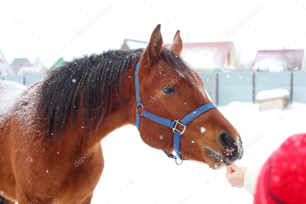 Horse feeding outdoors in winter