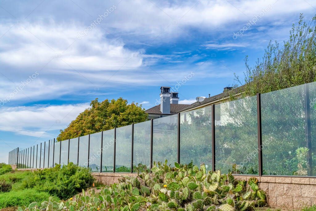 Glass fence in front of houses against cloudy blue sky in Huntington Beach CA. Scenic views at a seaside neighborhood with lush green foliage.