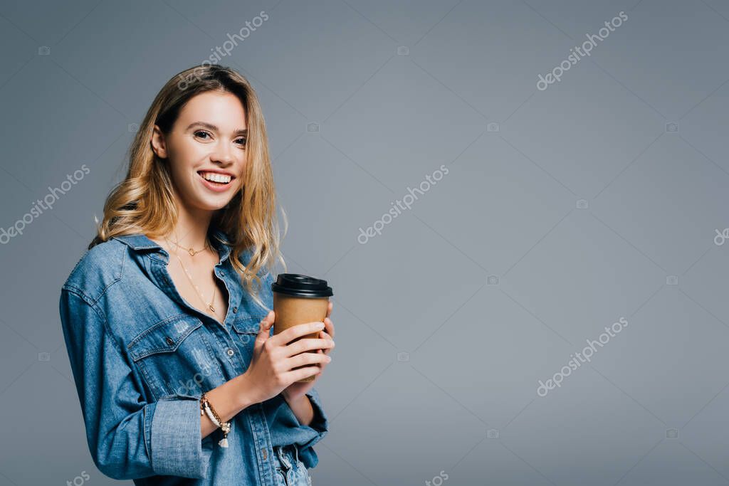 cheerful woman in denim shirt holding coffee to go and smiling at camera isolated on grey