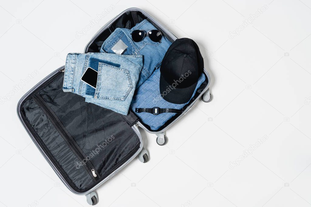 top view of suitcase packed with denim garments, black cap, smartphone, sunglasses and electronic wristwatch on white