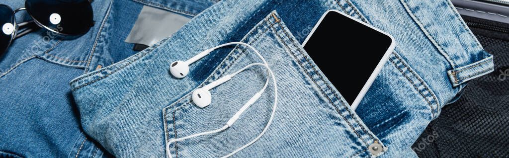 Close up view of mobile phone in pocket of jeans near earphones and sunglasses, banner