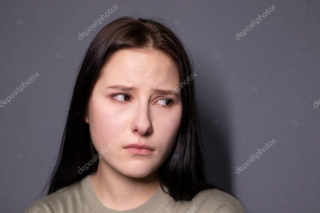 Portrait of charming sad brunette woman in marsh color t-shirt on grey wall background. actress acting, emotion. copy space