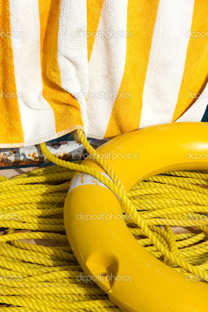 - Yellow life buoy, rope and towel on a pier