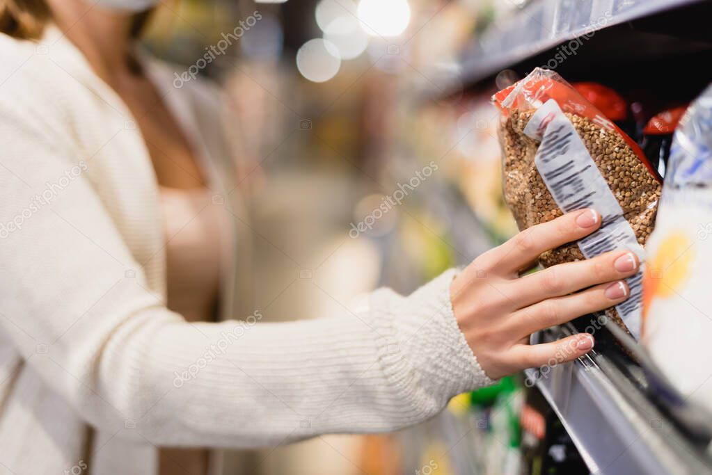 - Cropped view of woman taking package with buckwheat in supermarket on blurred background