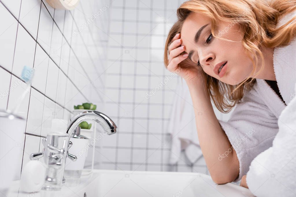 Pregnant woman in bathrobe feeling nausea in bathroom
