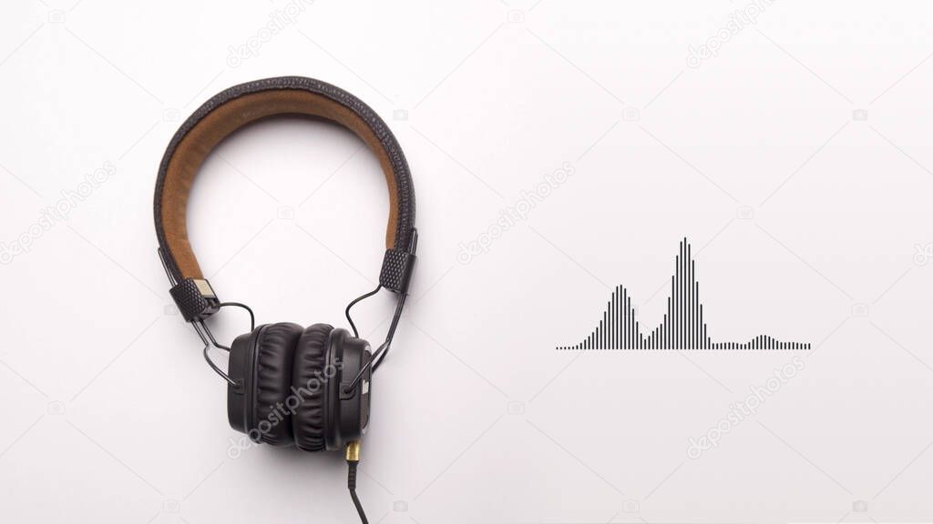 Full size headphones isolated on white background with moving equalizer graphs and glitch effect, seamless loop. Animation. Concept of electronic music.