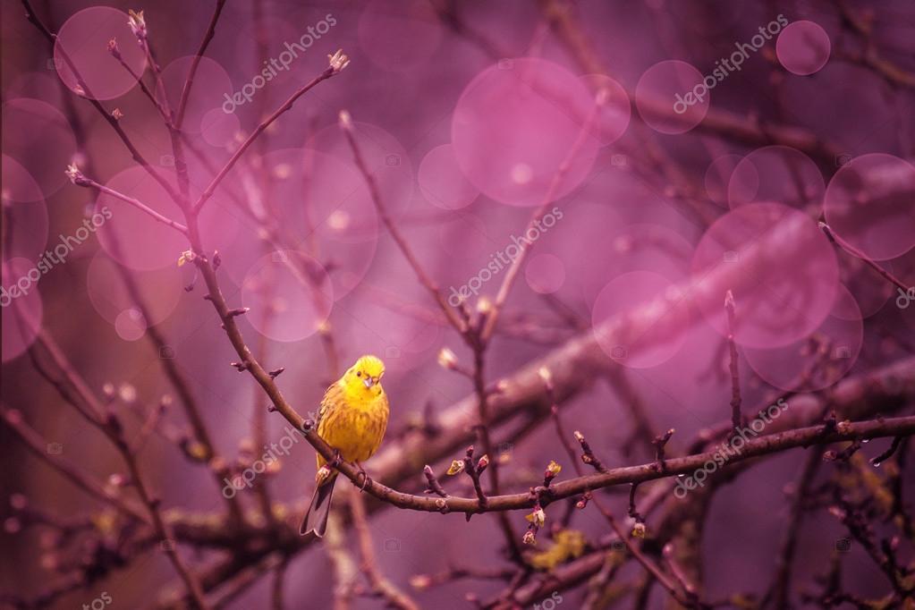 - Yellowhammer siiting on a branch in a purple inviroment
