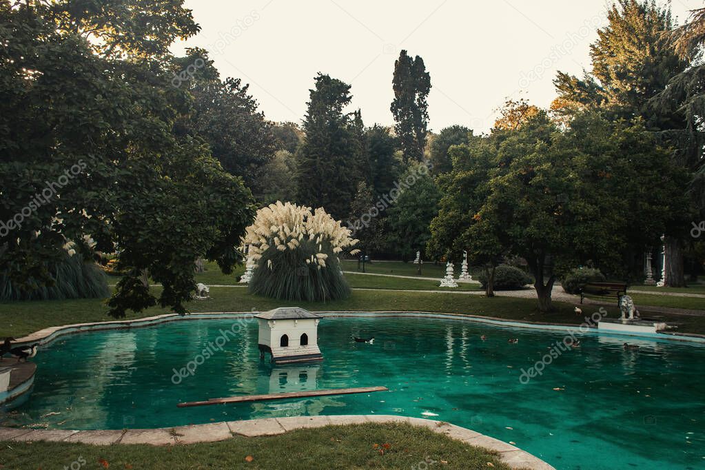 - bush of miscanthus near artificial lake with wild ducks in park