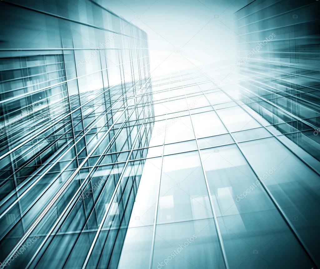 - Panoramic and prospective wide angle view to steel light blue background of glass high rise building skyscraper commercial modern city of future. Business concept of successful industrial architecture