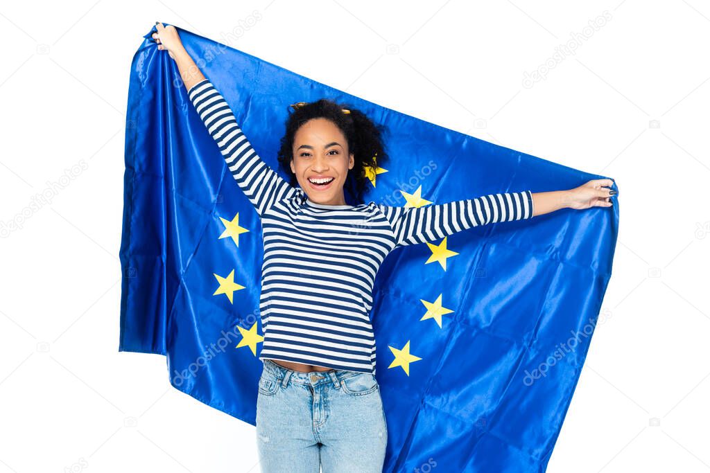 - excited african american woman with flag of european union, looking at camera isolated on white