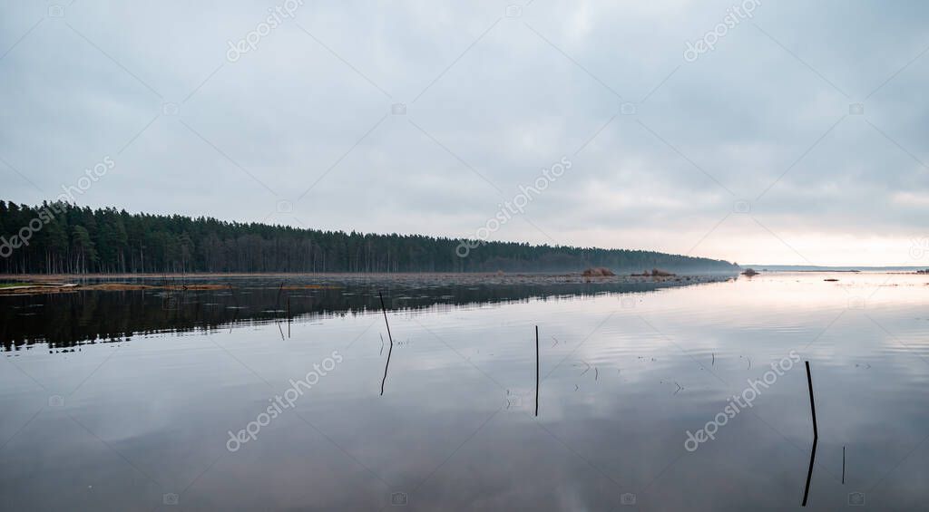 Lake Engure with the forest in the background in Latvia. Reflecting and calm water