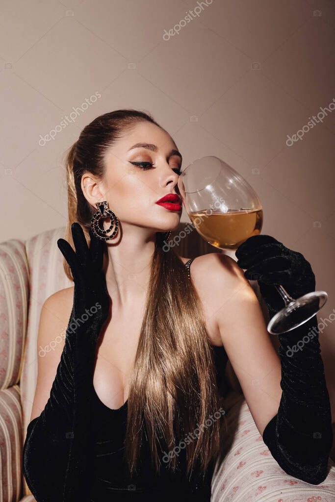 - fashion studio photo of beautiful sexy woman with blond hair in elegant clothes relaxing with glass of wine